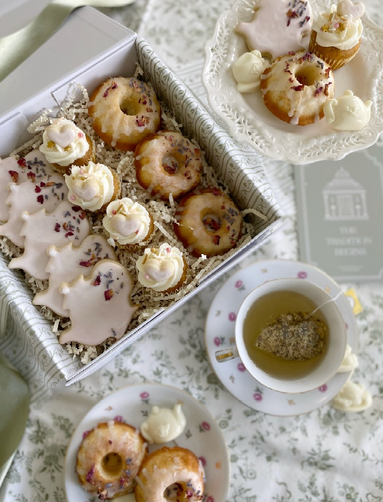 Beautiful magnetic closure gift box with our signature tissue, ribbon and embossed tag. Inclusive of 6 tea pot cookies, 6 seasonal bundts, & 6 tea cakes. If shipping, 6 iced tea cakes will be substituted for madeleines or tarts.
