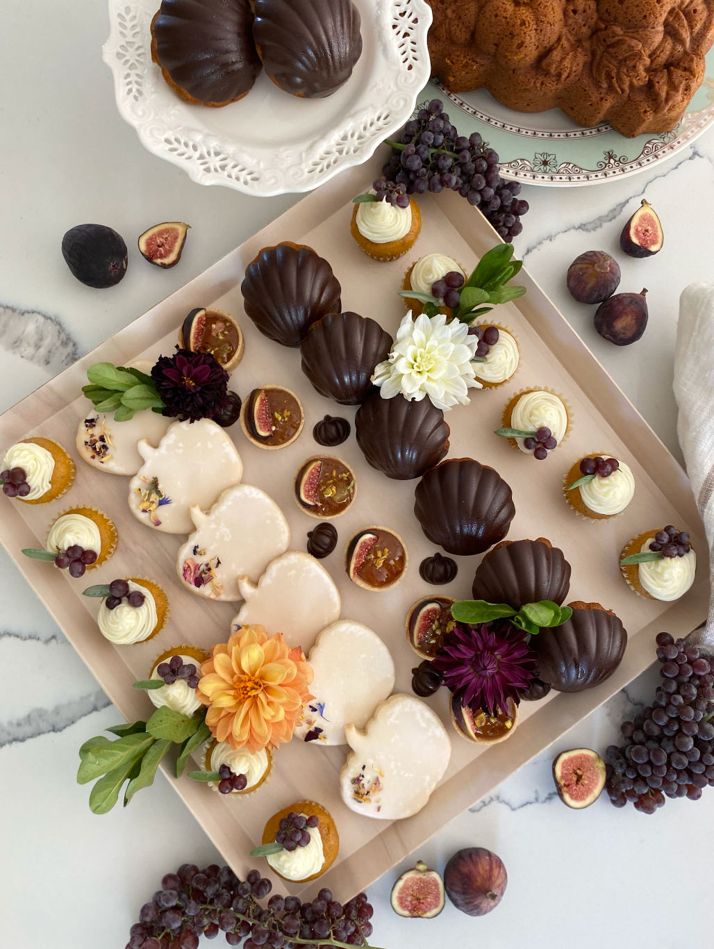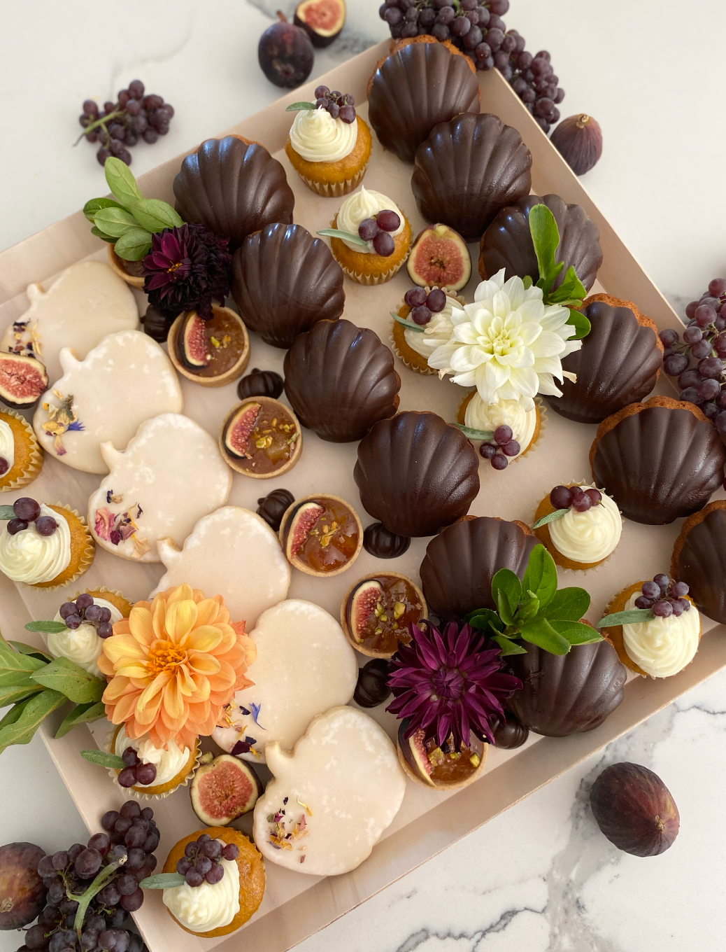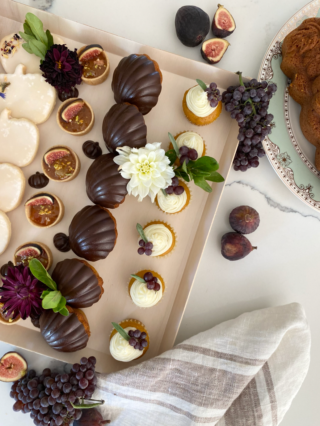 Our Autumnal Pumpkin Sweets Board brings out the flavors of the season. Inclusive of 3 dozen sweets, you will enjoy a variety of items such as our Dark Chocolate Pumpkin Madeleines, Vanilla Pumpkin Shortbread Cookies, Salted Honey & Pistachio Fig Tarts and Pumpkin Cupcakes w. Cream Cheese Frosting. Adorned with seasonal florals, this is the perfect gift or hosting tray.