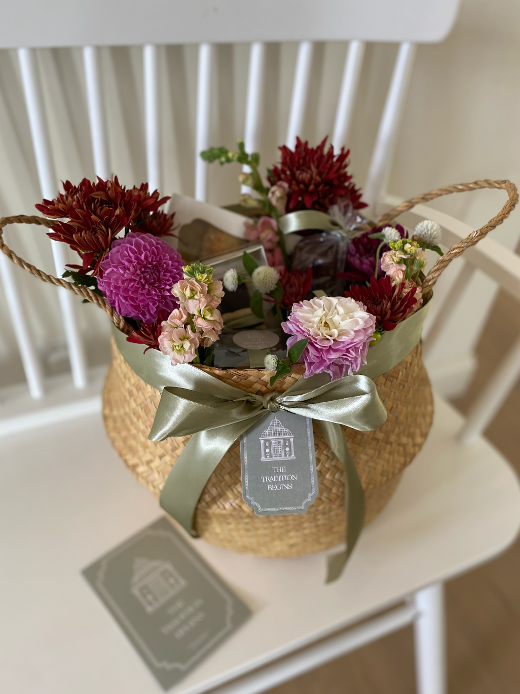Our Signature Sweets Gift Basket with Autumnal Flavors. This gift basket is adorned with fresh flowers, and filled with our homemade, hand decorated baked items.