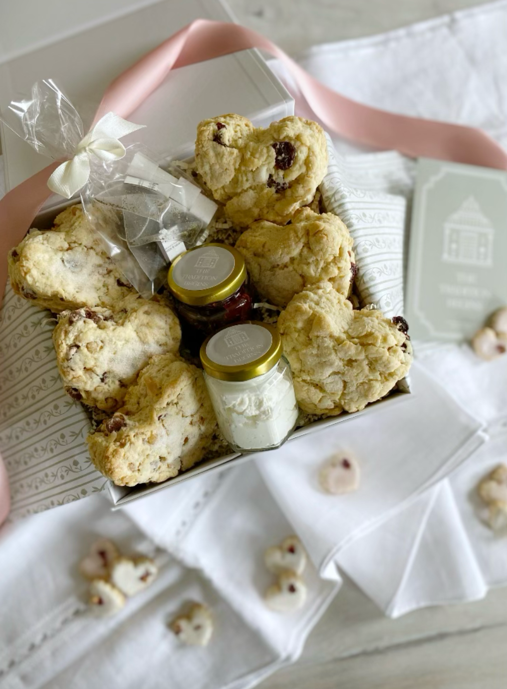 Our Valentine's Day afternoon tea box is inclusive of 3 heart shaped white chocolate cherry scones, 3 heart shaped chocolate toffee scones, jam, clotted cream, tea, sugar cubes.